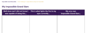 Resources IGS resources for you My own Impossible Grand Slam Assessment time 🙂 Go deep and assess where you surprised yourself “Wow, I did not know I was capable of doing that” what lights the fire in your eyes what your own IGS is Download here: IGS_template_my_own_IGS